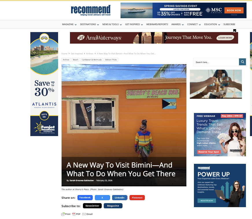 Just click here to read my latest Caribbean Dispatch column for Recommend magazine, in which I share what the flight was like. And then steal all my must-dos for a great stay on the closest Bahamian island to the U.S.