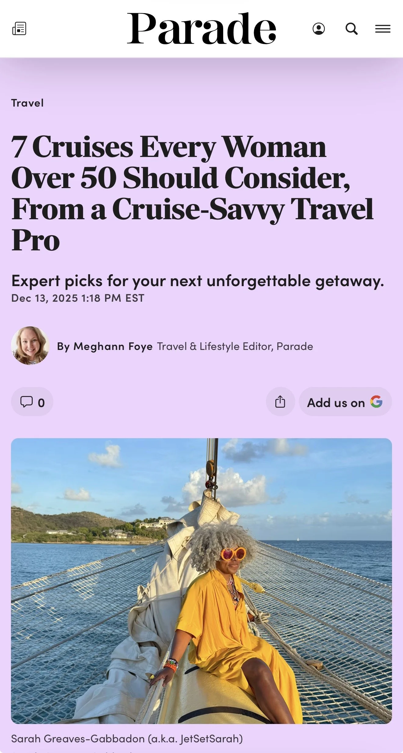 As a GenX-er who's sailed on more than 40 cruises, I was delighted to share my recommendations for cruise-curious mid-life women with the readers of Parade.